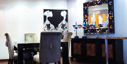 Conjunto compuesto por mesa repujada en madera y acristalada, aparador, cuatro sillas y dos sofás. Con extras de espejo y cuadros. Ideal para comedor de alta gama o para sala de reuniones en despacho profesional..